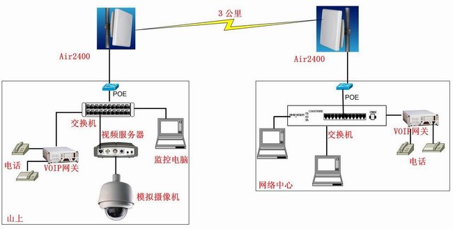 通過采用點對點方式建立無線寬帶網(wǎng)絡,在A點、B點分別安裝一套室外網(wǎng)橋Air2400-15,A點、B點的無線網(wǎng)橋都提供10/100BaseT以太網(wǎng)接口,可以雙絞線連接到交換機及VOIP網(wǎng)關的10/100BaseT以太網(wǎng)接口上。該設備內(nèi)置了防感應雷電的避雷器,可有效防護感應雷電,直擊雷電則通過建筑物的避雷針進行防護。同時,在各接口出使用美國3M出品的防水膠泥、膠帶,防止雨水進入設備。