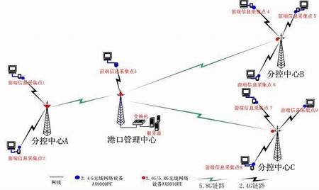 中山某港位于珠三角地區(qū),該市為家電、鞋襪、機(jī)電產(chǎn)品生產(chǎn)基地,出口數(shù)量巨大。該港口其岸橋、場(chǎng)橋機(jī)器設(shè)備都是幾十米高的龐然大物,每天都需要有條不紊的精確運(yùn)轉(zhuǎn),不能有任何故障差錯(cuò)。一直以來,為確保機(jī)器的正常運(yùn)轉(zhuǎn),以及作業(yè)調(diào)度計(jì)劃的實(shí)施和統(tǒng)計(jì),港口派專人定期來回奔波于各個(gè)岸橋和場(chǎng)橋,監(jiān)查機(jī)器自身工作狀態(tài)、錯(cuò)誤報(bào)警。同時(shí),對(duì)作業(yè)量進(jìn)行統(tǒng)計(jì)以往是通過工作人員將碼頭上的裝卸等數(shù)據(jù)先記錄在本上,匯總后再由專門負(fù)責(zé)錄入的工作人員輸入到數(shù)據(jù)庫,這樣不僅效率低,而且容易發(fā)生錯(cuò)誤,更不易保存。為了實(shí)現(xiàn)碼頭物流系統(tǒng)的信息化,決定在該碼頭建立無線網(wǎng)絡(luò)系統(tǒng)。