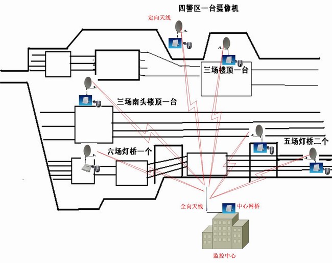 該站共6個(gè)貨場,此次共設(shè)計(jì)安裝6個(gè)監(jiān)控點(diǎn)。其中監(jiān)控點(diǎn)五場、六場分別安裝在四個(gè)貨場的龍門吊上,隨龍門吊移動可清晰察看現(xiàn)場裝卸工作情況。其余監(jiān)控點(diǎn)設(shè)在固定鐵塔上,實(shí)現(xiàn)對貨場進(jìn)出人員及車輛的實(shí)時(shí)監(jiān)控。監(jiān)控點(diǎn)設(shè)備選用大宏科技電信級無線網(wǎng)橋Air5800-E,其具有多種工作模式:可以實(shí)現(xiàn)點(diǎn)對點(diǎn)、點(diǎn)對多點(diǎn)、大范圍無線蜂窩漫游等功能,使用靈活方便。