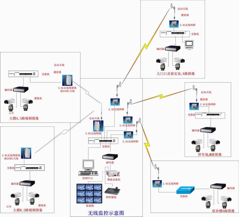 肇慶某工廠,面積大概40萬平方米。需要對整個工廠實(shí)現(xiàn)無線監(jiān)控,根據(jù)客戶需求及本公司的實(shí)際經(jīng)驗(yàn),設(shè)計(jì)在公司的辦公大樓A和B、宿舍樓、大門口均安裝攝像機(jī),并且通過無線的方式傳輸?shù)奖O(jiān)控中心,因?yàn)閭鬏數(shù)膱D像較多,所以在監(jiān)控中心屋頂架設(shè)4套Airwide無線網(wǎng)橋設(shè)備,為了錯開頻率及節(jié)省成本,設(shè)計(jì)為:大樓A、B使用5.8G頻率傳輸,其余為2.4G頻率傳輸。其中5.8G傳輸設(shè)備的配置如下:采用點(diǎn)多兩點(diǎn)的形式,中心點(diǎn)采用Air5800-E網(wǎng)橋,外接一副12dBi全向天線AW-5112,在A、B大樓上分別安裝1套5.8G Air5800-23網(wǎng)橋,該網(wǎng)橋集成23dBi高增益天線;2.4G傳輸設(shè)備的配置如下:大門口、停車場、宿舍樓均采用點(diǎn)對點(diǎn)的形式與中心點(diǎn)相連,采用無線設(shè)備為:Air2400-E,該設(shè)備外接天線,均配置16dBi定向天線,負(fù)責(zé)接收各點(diǎn)視頻數(shù)據(jù)及發(fā)出各種控制信號以控制前端視頻設(shè)備。