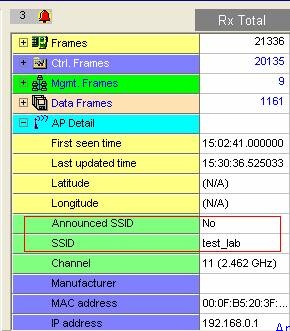 雖然禁用了SSID廣播,但是我們仍然可以通過偵聽無線數據包“透視”無線網絡查找SSID,Airmagnet Laptop就是這樣一款專業(yè)的無線網測試軟件,禁用SSID廣播這種小伎倆根本瞞不過它的法眼(圖一),Annouced SSID(通告SSID):NO,SSID:test_lab。Airmagnet快速準確的獲得了我們需要的信息,而且告訴我們它原本是不廣播SSID的,來看看此功能是如何實現的。
