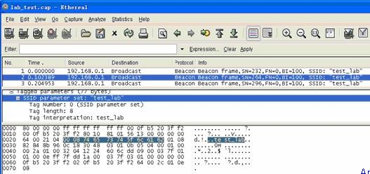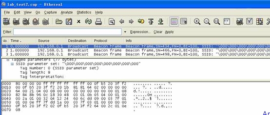 首先我們來看一下AP是如何將SSID廣播出去的。AP只要接通電源就會發(fā)送Beacon frame(信標幀)廣播,BI(信標幀的發(fā)送間隔)為100毫秒,也就是說每秒鐘發(fā)送10個信標,來看一下捕捉到的Beacon frame信標幀(圖二), 看看它里面都有什么?最基本的信號強度,所在的Channel(信道),當然還有SSID parameter set:”test_lab”等等。沒錯,如果AP廣播SSID,那么信標幀中就會包含SSID的信息就會被添加到中廣播出去,這樣在PC“查看無線網絡”的時候就能看到有這么一個SSID的存在。不廣播SSID的Beacon幀是什么樣呢?(圖三),SSID parameter set:”\000\000\000\000\000\000\000\000”, Beacon幀里不再包含SSID信息?!半[身術”就是這么實現的。