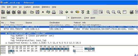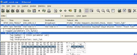 對于廣播SSID的AP,PC能夠從“查看無線網絡”看到SSID,點擊想連接的SSID實際上就是在發(fā)送探測請求,或者叫連接請求,AP“應答”,確認身份,建立連接。不廣播SSID的連接過程就稍微的復雜一些了,因為AP不廣播SSID,PC是無法知道要向哪個信道去發(fā)送連接請求的,所以這時候PC會向全部13個信道發(fā)送探測請求,直到收到AP的應答,然后就能進行后面的連接過程了。關鍵就在于此!我們來看一下NO.8749這個Probe request探測請求幀都包括什么(圖五),正如我們所料,這里面SSID parameter set:”test_lab”這個參數——“誰是test_lab?”