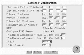 隨后我們可以自行設(shè)定無線路由器的ESSID值,默認為WLAN。所設(shè)定的ESSID值必須牢牢記住,它就好比是一道檢驗密碼。所有的無線網(wǎng)卡必須使用相同的ESSID值才能與無線路由器通訊。如果無線路由器還需要連接100/10M有線網(wǎng)絡(luò),那么我們還需要進行進一步設(shè)置。在主界面選擇CONFIGURATION→Advanced→IP/DHCP,出現(xiàn)System IP Configuration 配置界面。此時我們所要做的僅僅是將當(dāng)DHCP一項設(shè)為Enable,一旦用戶的有線網(wǎng)卡和無線網(wǎng)卡的TCP/IP屬性設(shè)置成自動獲得IP地址,就能由無線路由器處得到一個IP地址了(圖2)。