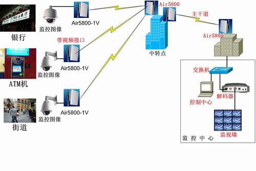 在本系統(tǒng)中,無線網(wǎng)絡(luò)設(shè)備全部采用大宏科技的Airwide無線網(wǎng)絡(luò)產(chǎn)品以點對點、點對多點的無線聯(lián)接方式,聯(lián)接70個監(jiān)控點,前端每個攝像頭配置一臺Air5800-1V無線網(wǎng)橋,該網(wǎng)橋內(nèi)置網(wǎng)絡(luò)視頻服務(wù)器,接收點用Air5800設(shè)備接收,整個系統(tǒng)采用5.8G的頻率設(shè)備。構(gòu)成以派出所為監(jiān)控中心的寬帶無線網(wǎng)絡(luò)。Air5800-1V采用先進的MPEG4硬件壓縮技術(shù),對每個監(jiān)控點以1-2M速率,在網(wǎng)絡(luò)上以30幀/每秒傳輸高質(zhì)量的實時視頻圖像,終端以硬件解壓,通過矩陣上電視幕墻。